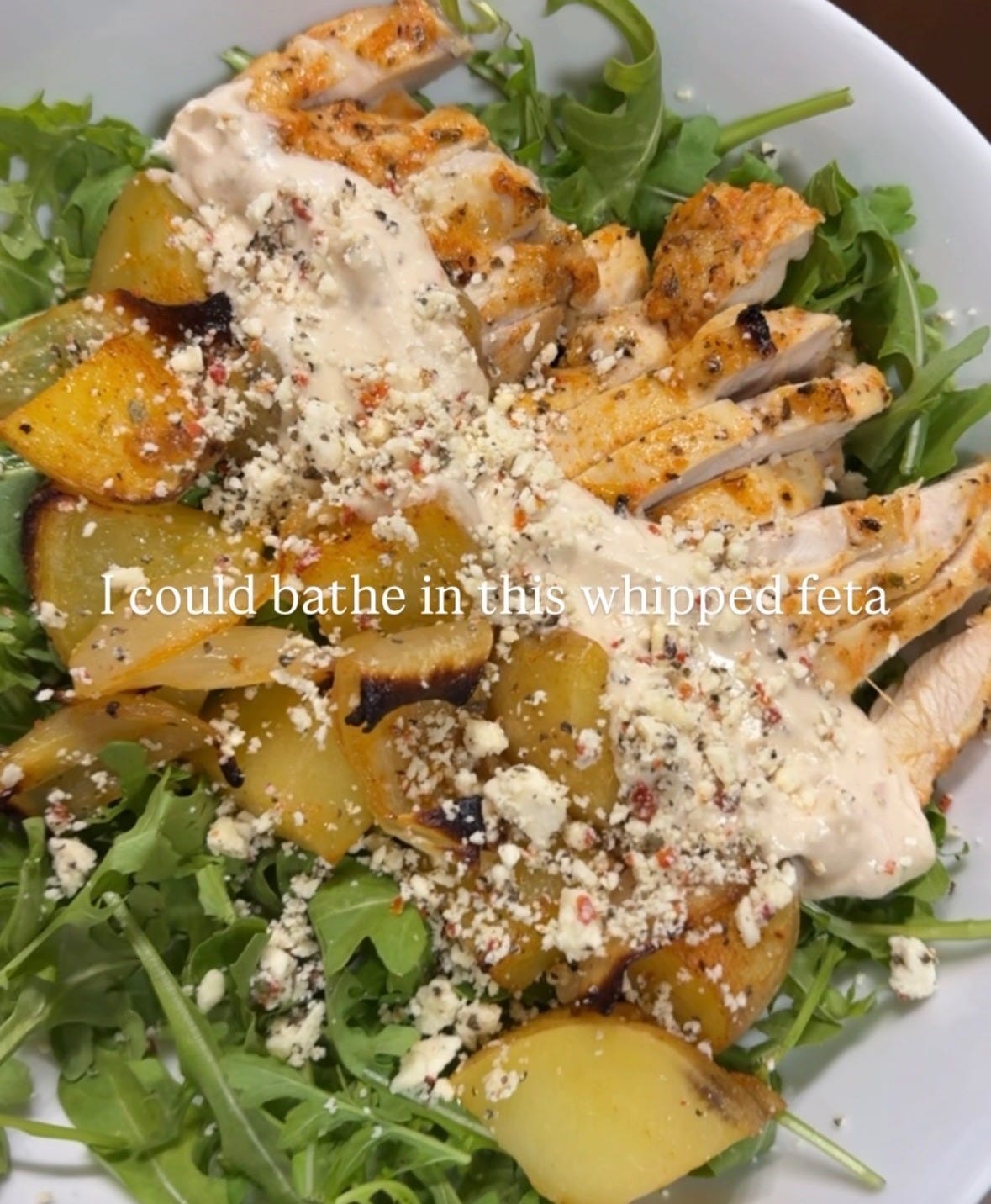 6. Garnish with crumbled feta and serve with greens or your fave steamed green veggie