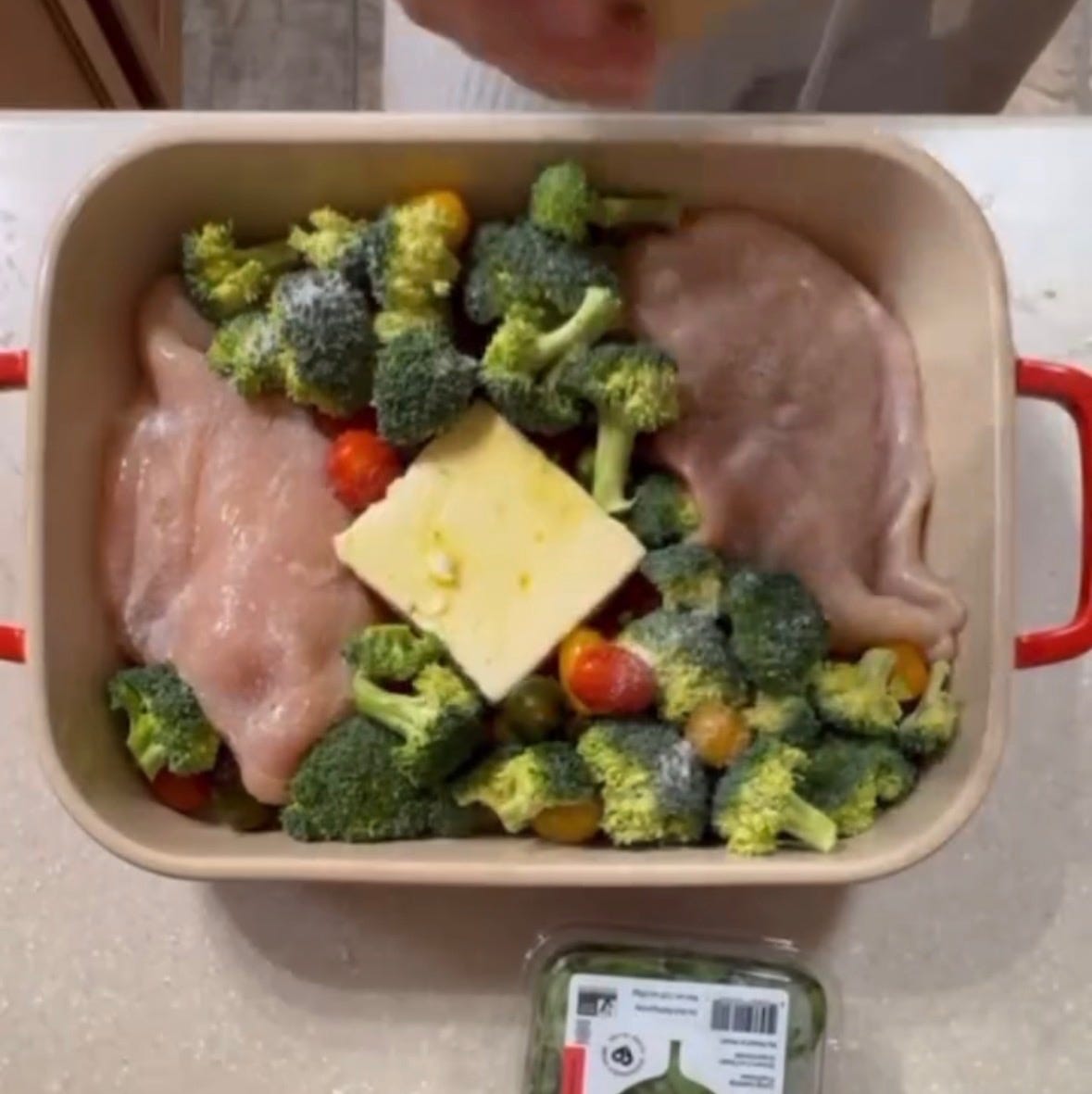 In a large casserole dish, add the feta block, olive oil, cherry tomatoes, broccoli, and chicken, spacing the chicken evenly and placing the feta in the middle.