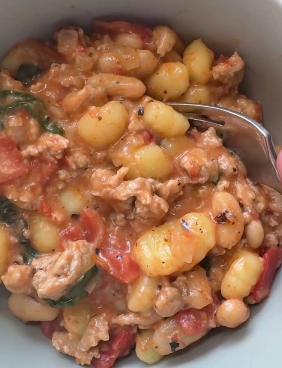 If in rush, can heat gnocchi separately in additional pan with oil on medium heat while cooking meat & onion. If you do this, add in gnocchi when you add in beans/ tomatoes/spinach